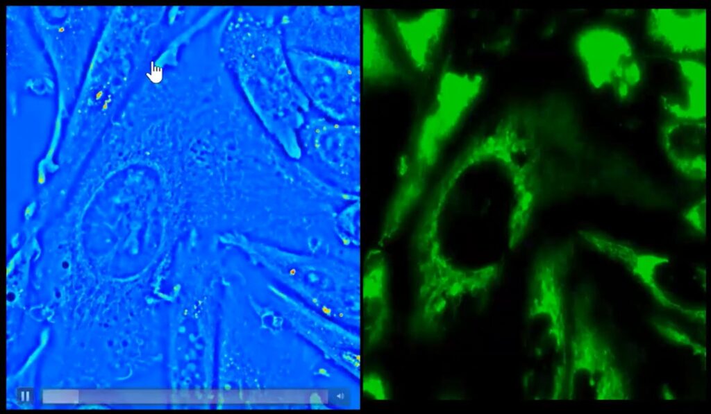 - Fluorescence: as shown above, one may use QPI on microscope that also support fluorescence. In the video, Prof. Popescu mentions that it may be possible to use fluorescence to develop ground-truth data to train AI models that may be able to predict biologically significant characteristics of live-cells.